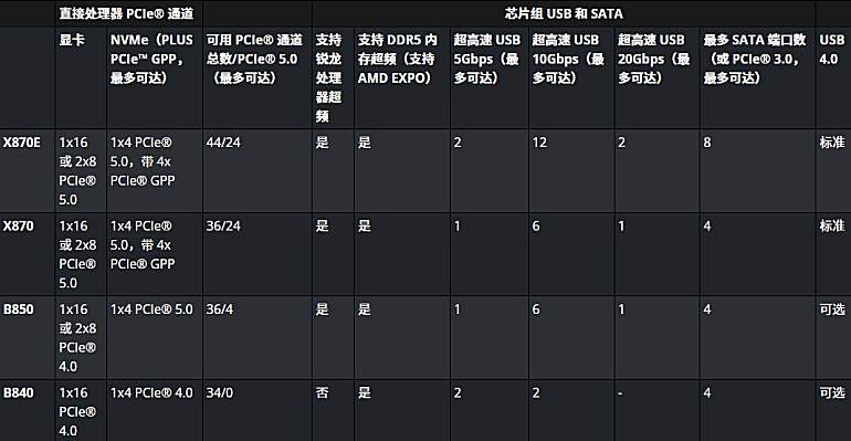 800系列芯片组则对定位进行了变更,X870E和X670E的规格是一样的,同样的双芯片架构。但是X870却变成了和B650E一样的单芯片设计。和上代不同的是,现在X870E/X870强制要求主板必须配备USB4接口。