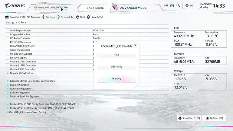 以支持该分配方案的技嘉 X870E AORUS MASTER X3D ICE主板为例,我们可以在其主板BIOS的IO接口设置中看到“USB4/M2B_CPU Switch”选项,该选项有“Auto”“USB4 Only”“M.2 Only”三个选项。
