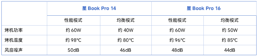 烤机分析:性能模式下,星Book Pro 14的CPU考机功率约60W(最近温度降低了,如果室温偏高持续功率约为55W),温度在98℃上下,星Book Pro 16的CPU考机功率也是60W,温度大概是96℃。满载下两款机型的用户位噪声都不算吵,但星Book Pro 16表现更好一些:星Book Pro 14是50分贝,星Book Pro 16是48分贝。同时两款机型的C面温度也都不高,最高不过40℃上下,满载时C面很凉快。