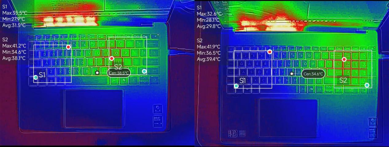 ▲性能模式下的满载C面温度图,左侧是星Book Pro 14,右侧是星Book Pro 16