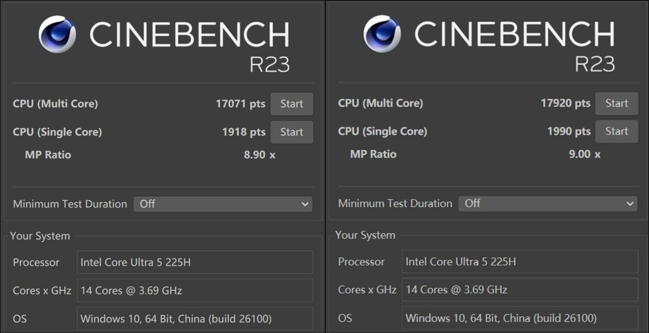 从基准测试来看,星Book Pro 14和星Book Pro 16的CPU基准跑分基本没有差异,例如在Cinebench R23多核测试中,星Book Pro 14的成绩是17017,星Book Pro 16的成绩是 17920,非常相近,其他项目也类似,所以这里可以回答大家一个问题:选星Book Pro 14和16,性能是最不需要纠结的点,大家日常使用起来基本无差异。同时,作为对比,Cinebench R23多核能跑17000分以上,已经达到了上一代Ultra 7 155H(考机功率55W)的水平,而后者的规格可是16核22线程——从中可以看出,这代Ultra 5 225H表现相当强劲。这样的性能输出,对于所有的日常应用,包括上网看视频、Office办公应用、编程、Ps图片处理等等星Book Pro 14/16都可以轻松搞定,且偶尔的专业应用也可胜任,比如学习3D渲染、短视频剪辑等等。
