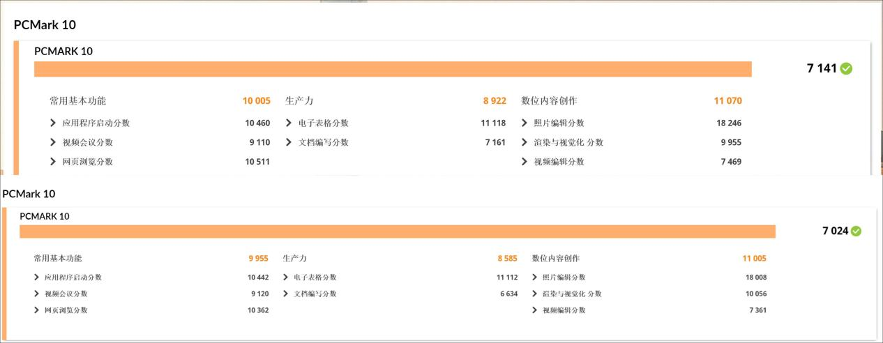 ▲PCMark10的办公性能测试包含了常用基本功能、生产力、数位内容创作。两款机型的分数分别是7024和7141(星Book Pro 14略高一点儿),跑分很高且相近,应对日常应用轻松愉快。