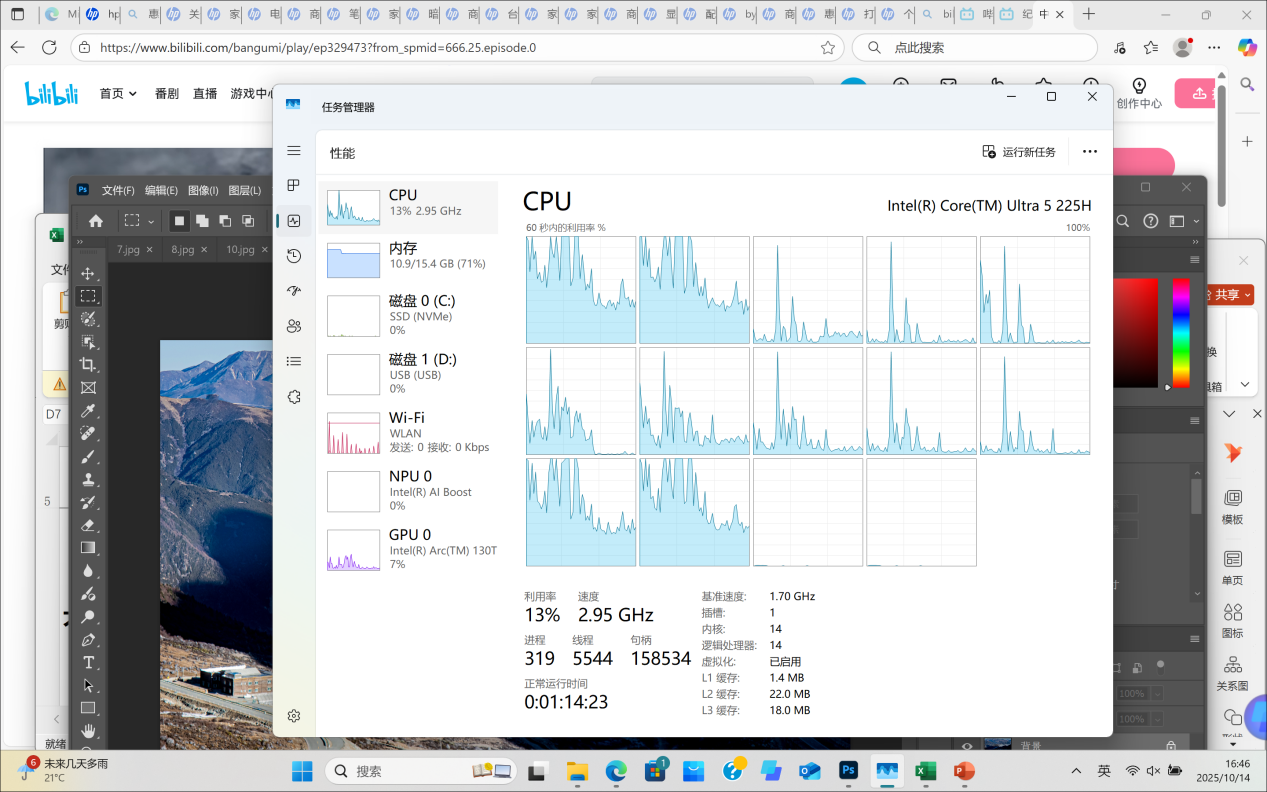 星Book Pro 14/16的CPU性能表现差异极小,所以这里牛叔就以单一机型,即星Book Pro 14为例来体验分析。在16GB内存下,星Book Pro 14应对日常多开应用表现如何?我们打开20+个浏览器网页,并播放B站视频,打开PS载入15张高分辨率图片,打开超过100MB的Excel文件,此时内存占用在11GB上下,对于一款16GB容量内存的轻薄本,基本上算是重度日常多任务使用场景了。随即我们在PS中进行滤镜处理、在表格中编辑保存、拖动在线视频播放等操作,响应流程无卡顿,同时该机全程保持了安静的使用体验。