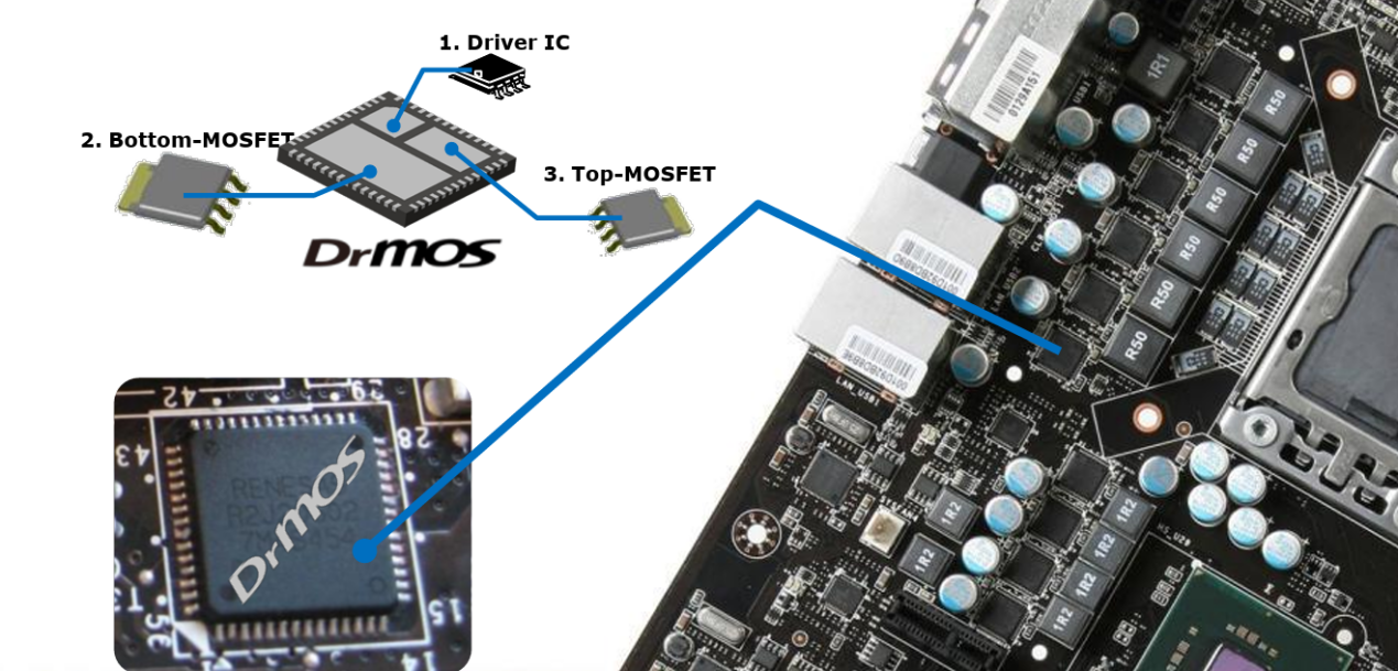 主流是DrMOS (一体式供电),把上下桥MOS和驱动芯片封装在一起,变成一个看起来更高级的小黑方块。效率高(单相承载50—70A)、发热低、电流大。