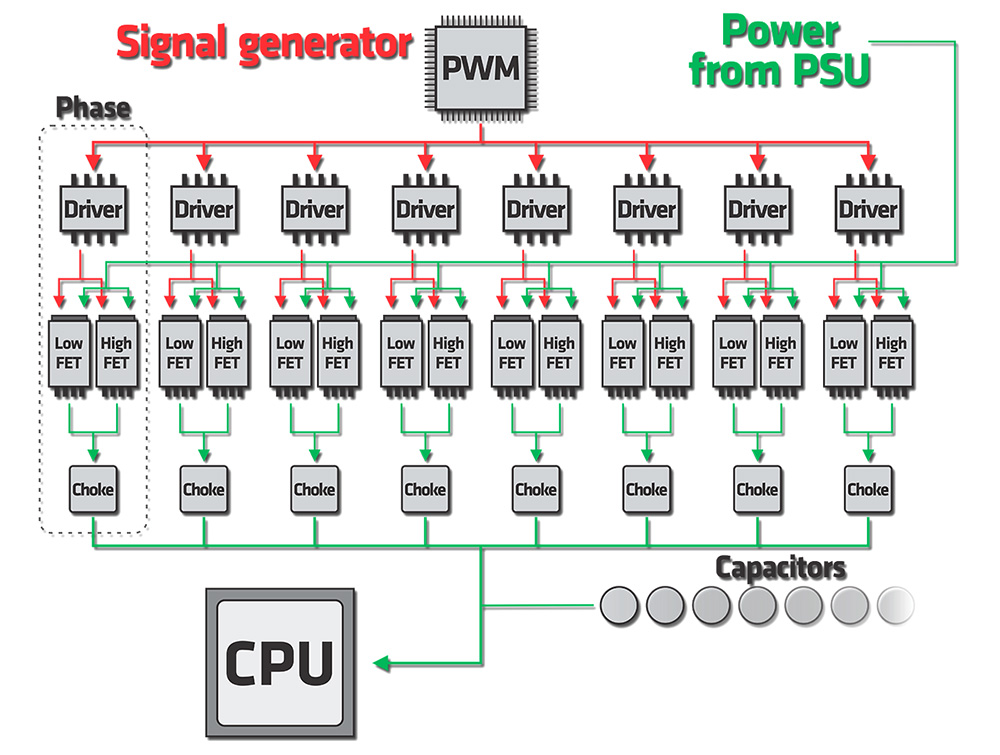 如果把CPU比作一个嗷嗷待哺的婴儿(而且是个大胃王),那电源(PSU)就是做饭的厨房,供电控制芯片(PWM)是喂饭的手,而主板供电模组(VRM)就是负责喂饭的勺子。