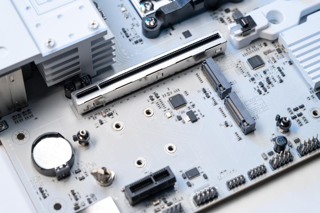PCIe插槽部分,显卡全长插槽配备合金装甲加固,支持一键快拆,同时还提供了1个PCIe ×1插槽,方便扩展万兆网卡、采集卡等设备。