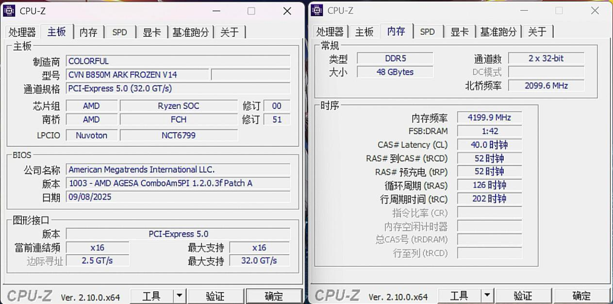 在CVN B850M ARK方舟豪华用料和出色的电气性能支持下,我们可以很容易地为锐龙9 9950X3D这样的旗舰U搭配上DDR5 8400的高频内存。如图可见,这套DDR5 8400 24GB×2内存在CVN B850M ARK方舟上运行得十分稳定,相比之下,同级竞品大都只宣称支持到DDR5 8000,这让CVN B850M ARK方舟的优势更加凸显。