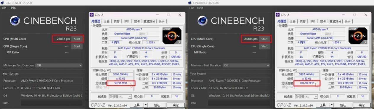 CVN B850M ARK方舟一大特色卖点就是板载独立时钟芯片,支持处理器外频调节。这个功能的好处除了可以配合倍频调节挖掘处理器超频极限之外,还能让锐龙7 7800X3D这样不支持倍频调节的处理器也玩上超频。我们这里使用锐龙7 9800X3D进行测试,从图上可见,我们将外频增加了2MHz,实际显示从99.95 MHz提升到101.98 MHz,Cinebench R23多线程得分也有了2.7%的提升。