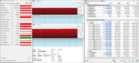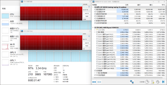 室温15℃左右,大师模式下,对暗影精灵11锐龙版进行双考测试,半小时之后的情况如下所示:锐龙9 8945HX功耗约55W,温度77℃,RTX 5060持续输出功耗约115W,温度约78℃,整机性能释放约为170W。