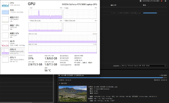 视频制作是目前非常普遍的专业应用之一,其中视频输出比较耗费时间,这里我们利用ME CC将18分钟的4K视频转码至1080P,在RTX 5060显卡加速下,暗影精灵11锐龙版耗时仅约4分40秒,效率非常高。
