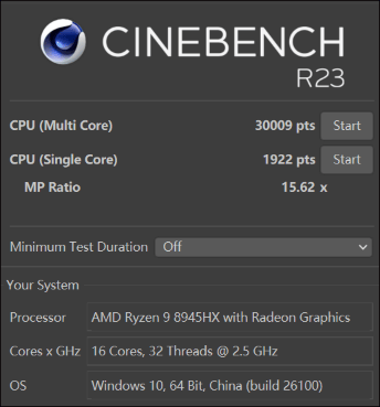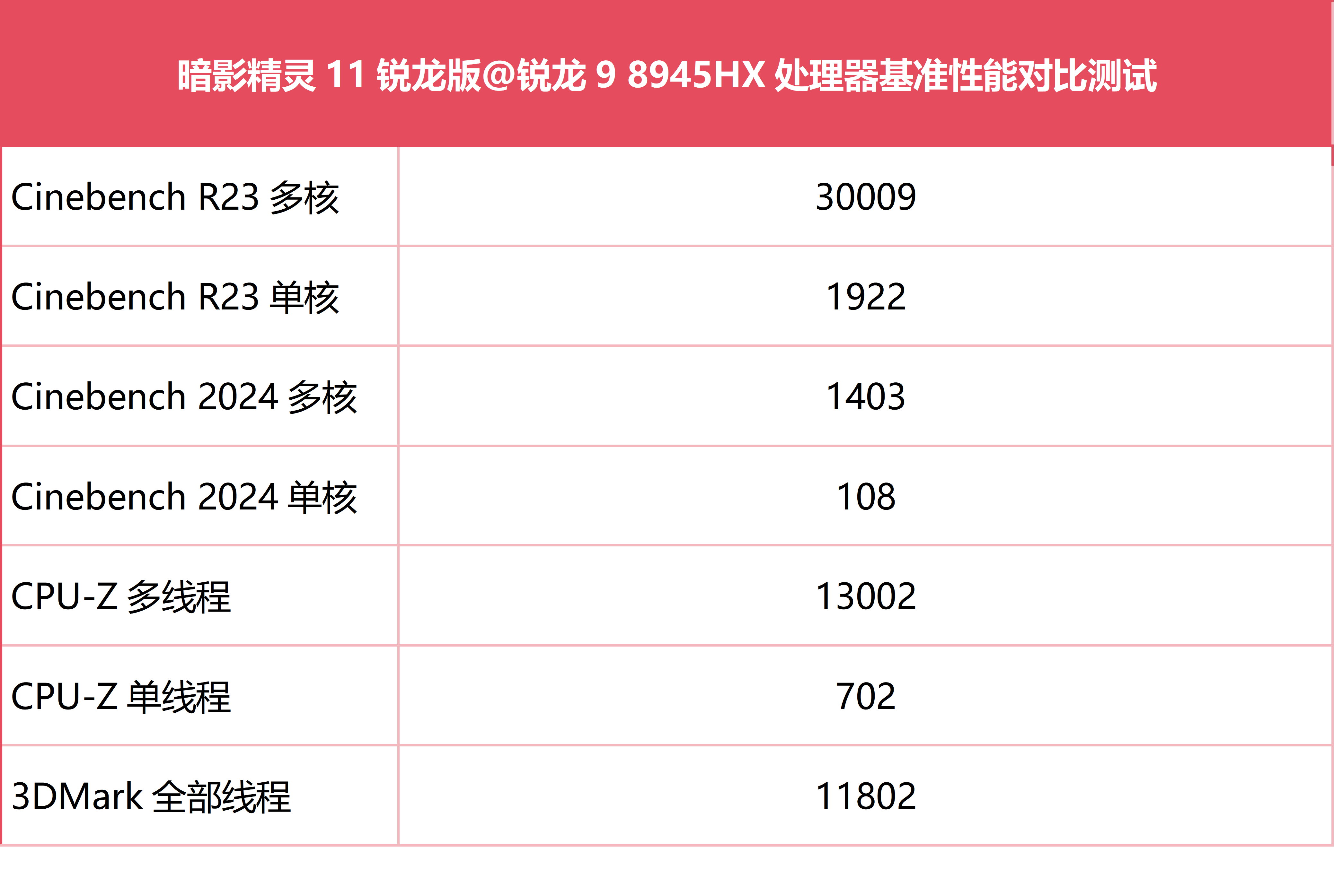 基准测试分析:在Cinebench R23多核测试中,锐龙9 8945HX的分数是30009分,突破了30000分,同时需要说明的是,暗影精灵11锐龙版无爆发功耗,所以这个成绩是完完全全的82W锐龙9 8945HX跑分,那这个水平怎么样呢?相当能打,应对各种专业、重度应用可以说都不在话下,3A游戏更不是问题,仍是目前游戏本CPU中的一员猛将。