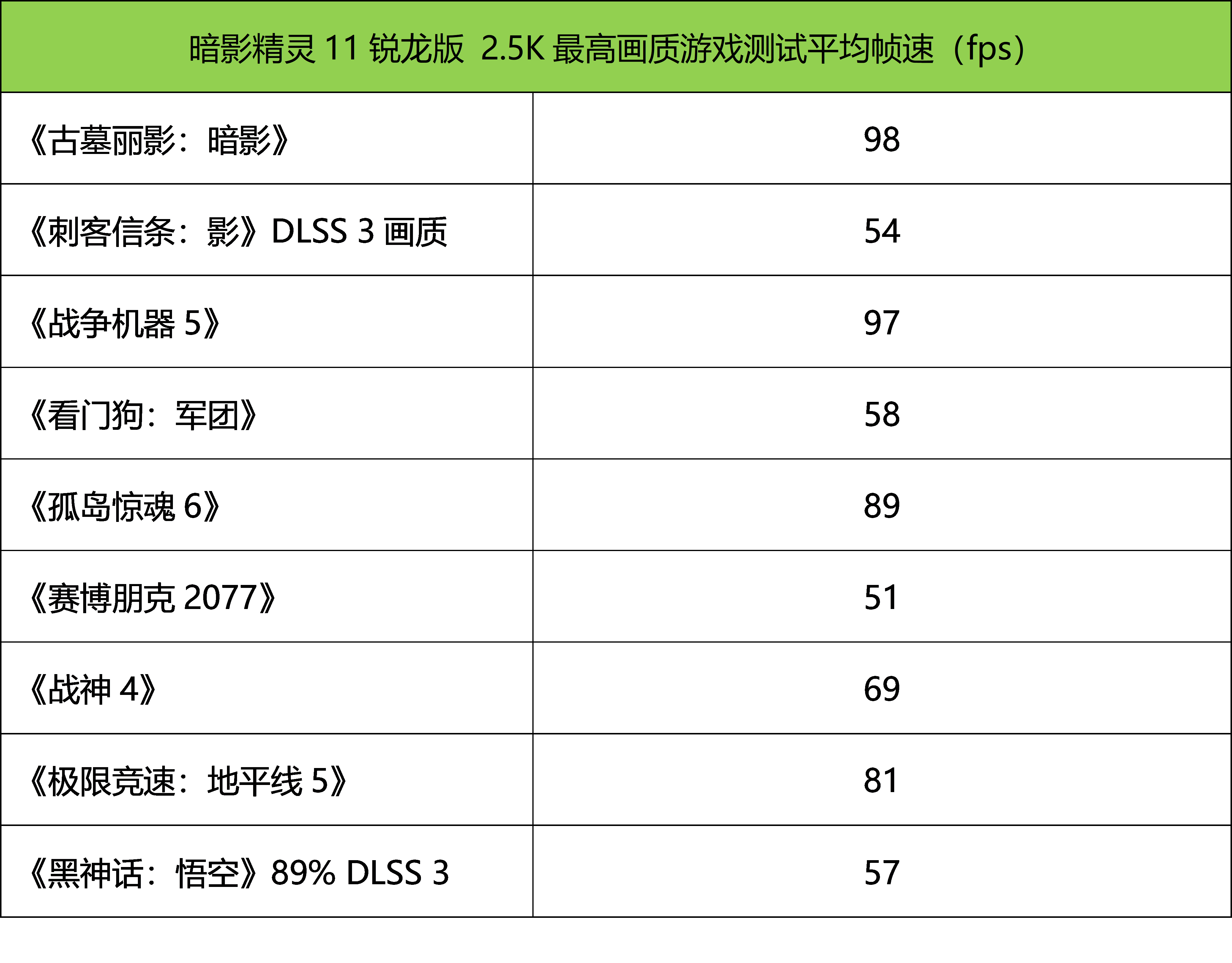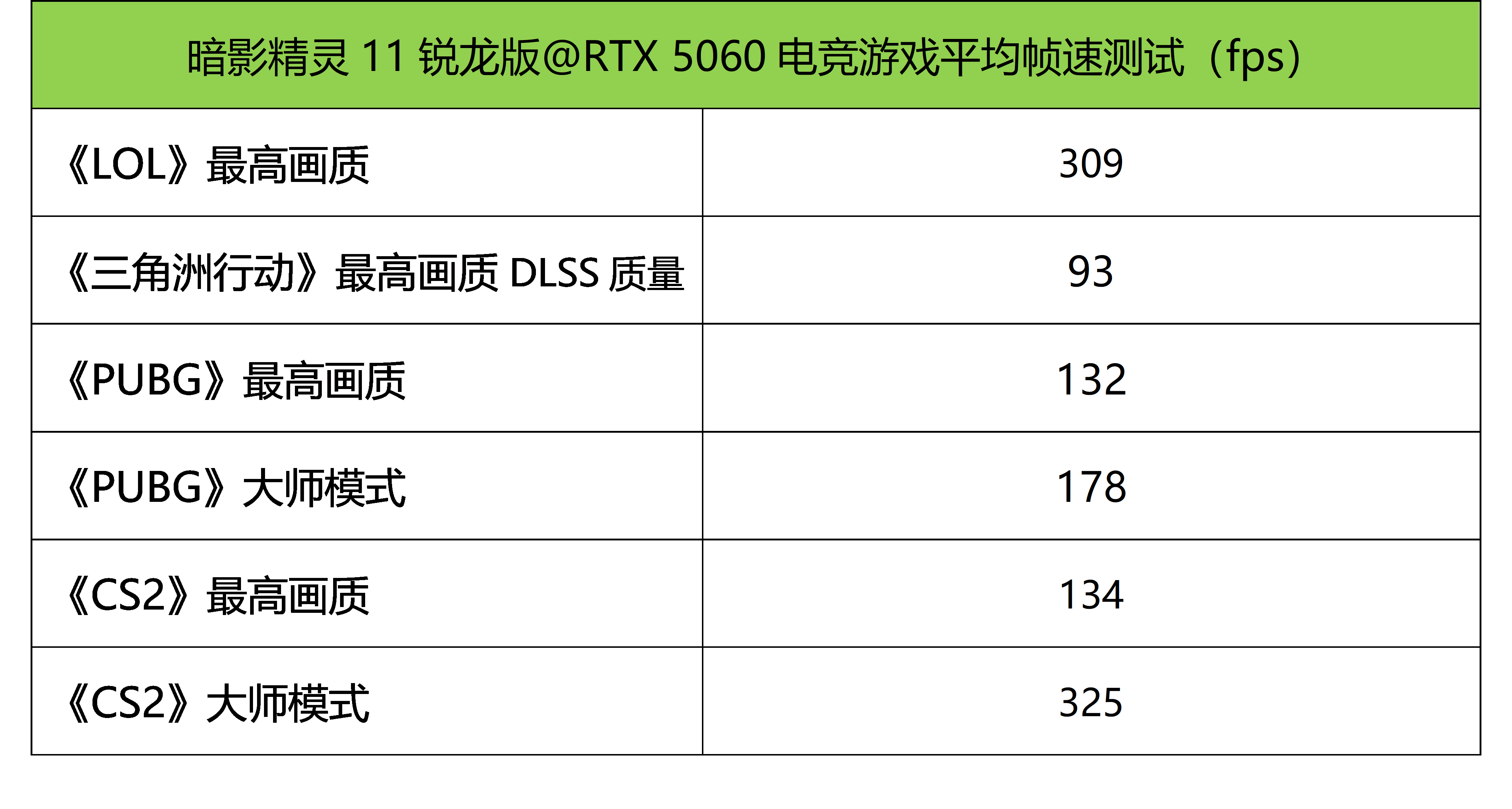 从游戏实战测试来看,暗影精灵11锐龙版的表现不错,在2.5K分辨率预设最高画质下,大部分3A大作都能跑到60fps以上的平均帧速,流畅运行。而针对要求较高的《黑神话:悟空》《刺客信条:影》这类游戏,一方面大家可以开启DLSS来提高帧速;另一方面也可以适当降低画质。总体上而言,RTX 5060应对2.5K分辨率高画质3A大作,问题不大。