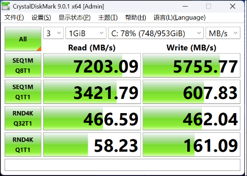 该机标配的是1TB PCIe4.0 TLC颗粒SSD,实测连续写入速度达到了7203MB/s,连续读取速度达到了5755MB/s——性能强的SSD,代表着日常使用响应极速无卡顿。