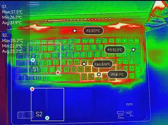 C面温度方面,热量堆积主要在光标按键附近,但也不热,最高40℃左右,整体都非常凉爽,高负载下也完全不会影响操作体验。