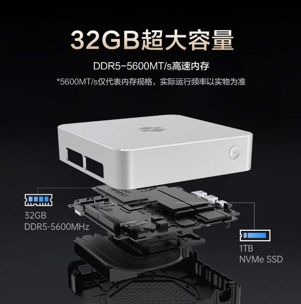 imini Pro830在内存与存储方面也提供了较充足的起点。出厂即配备两条16GB DDR5-5600MHz内存,组成32GB双通道,不仅响应迅速,也能更好地应对新一代AI应用对内存的需求。1TB PCIe高速固态硬盘则为用户提供了宽裕的存储空间。如果未来需要扩展,该机保留了可升级内存的设计,并额外预留了一个PCIe 4.0×4 M.2接口,方便用户自行加装硬盘,延续了机械革命在扩展性上的贴心考量。
