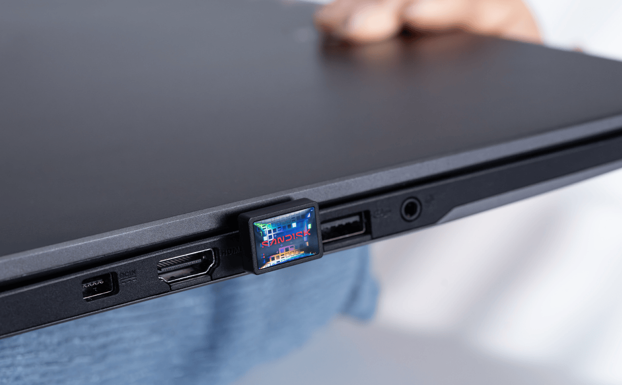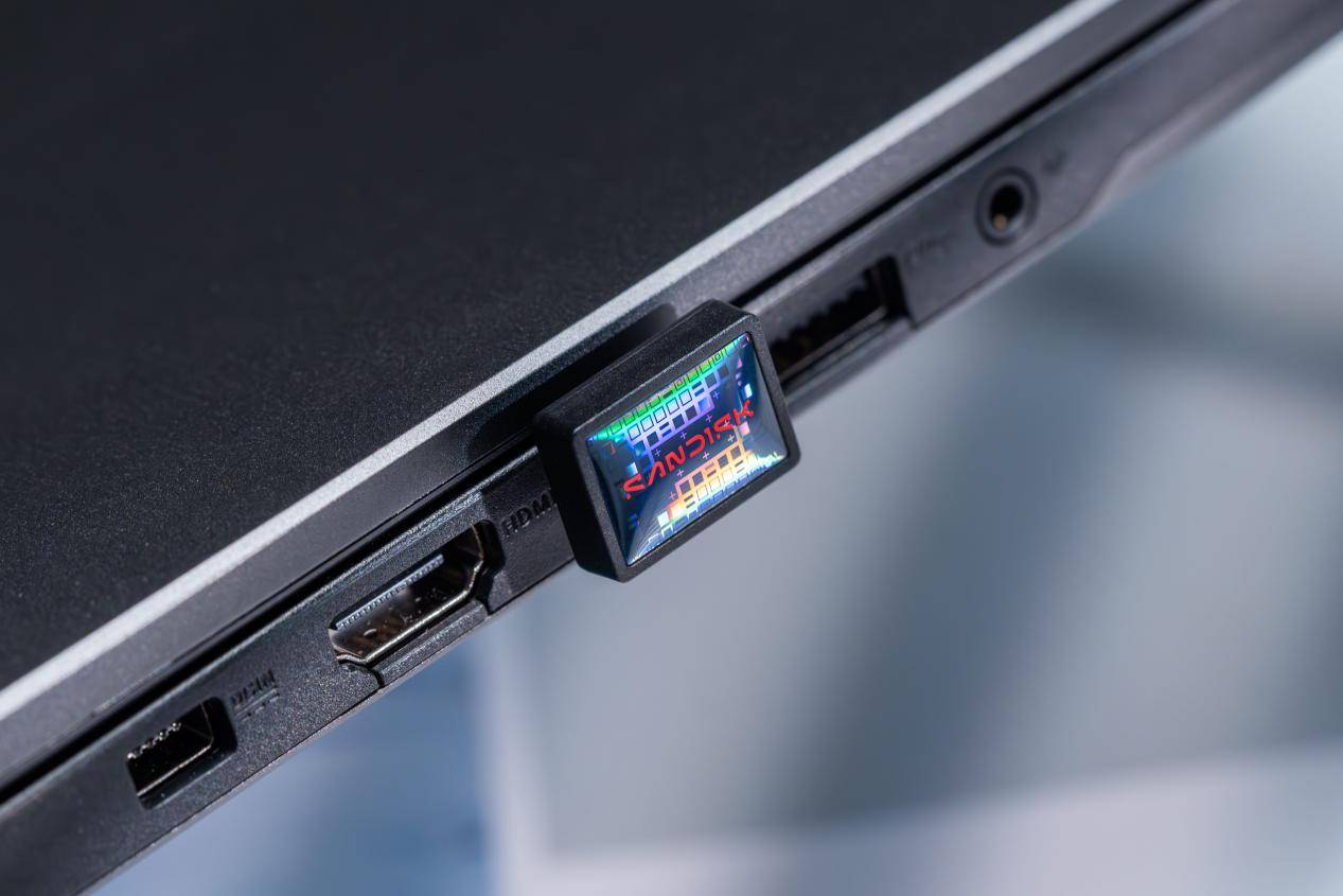 此次体验,我们搭配了华硕天选 Air 2026 款轻薄本(标配 32GB 内存 + 1TB 内置固态硬盘)做为核心设备,将闪迪至尊极速小神盾闪存盘插在轻薄本的Type-C接口,可以看到它能够轻松跟机身融合到一起,不管是开着盖还是合上盖子,都很贴合。这样一来,闪迪至尊极速小神盾闪存盘就可以跟我们平时使用无线键鼠的接收器一样,“长”在笔记本上,实现扩容的同时丝毫不会增加额外的负担。