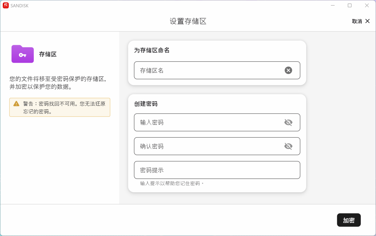 当你将重要的资料备份到闪迪至尊极速小神盾 Type-C 闪存盘之后,可以对其进行加密处理。在设置密码时,一定要注意记录下来,因为密码找回功能不可用,在一定程度上也给重要数据彻底上锁,保障安全。另外,在设置密码之后,仍然可以更改密码。