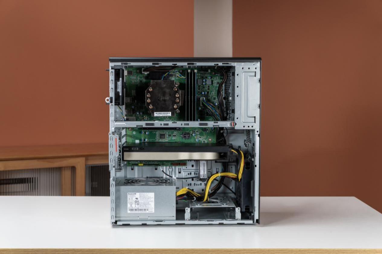 联想开天P5h G1t的内部设计与扩展能力,体现了工作站级的专业功底。GPU方面,测试机搭载的是一块具备32GB超大显存容量的专业独显,同时主板配备PCIe 5.0插槽,支持双卡或3.5宽专业显卡,兼容多种专业扩展卡,并可定制搭载摩尔线程X300/S50、沐曦N260等国产专业显卡。存储方面,测试机布局合理,扩展性强,带有4根内存插槽,最高可扩展至128GB内存。硬盘则最高支持1个PCIe M.2 SSD+3个3.5英寸机械硬盘。电源最高可搭载1100W专业电源,不仅完全够用,而且可以充分释放出GPU的性能。