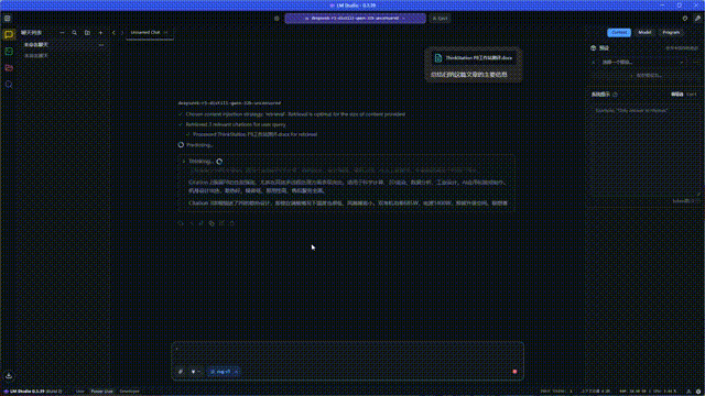 测试基于联想开天P5h G1t工作站搭载的32GB大显存专业显卡展开。牛叔使用LM Studio在联想开天P5h G1t上部署了DeepSeek-R1-32B大模型,并载入一篇约8000字的文档,模拟日常编辑需求,令其分析文档核心内容。其表现如下:思考(推理)时间仅14.35秒,文字输出速度达23.9 token/s,整个过程十分流畅,输出质量完全达到了好用的水准。另外,如前面所言,工作站除了测试搭载的专业显卡以外,同样可搭载摩尔线程X300/S50、沐曦N260等国产专业显卡,也支持本地部署32B AI大模型。实际上,普通信创台式机由于很少搭载超大显存专业独显,所以基本无法流畅运行32B本地AI大模型,这也是联想开天P5h G1t工作站的优势之一。